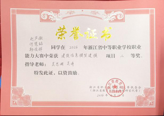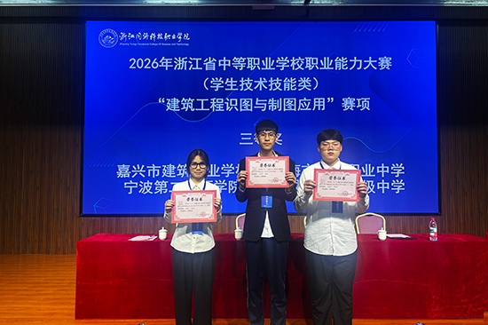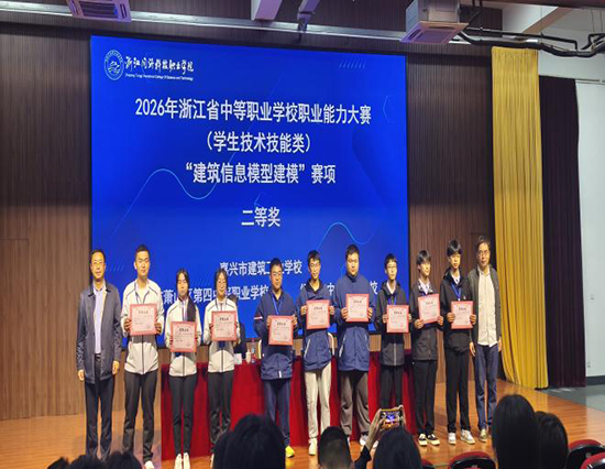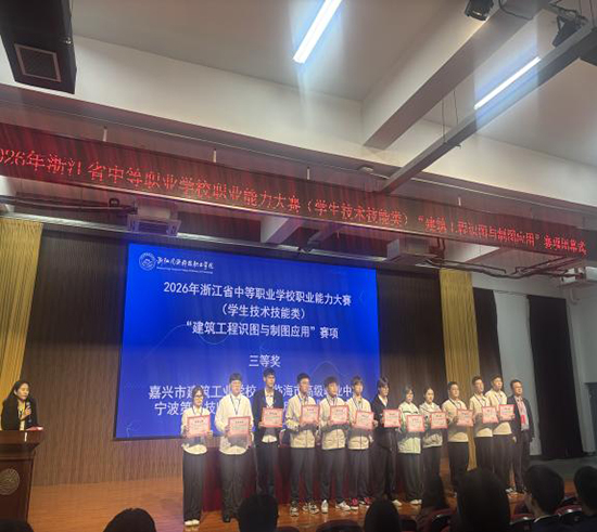4月11日至12日,2026年浙江省中等职业学校职业能力大赛(学生技术技能类)建筑工程识图与制图应用、建筑信息模型建模两大赛项分别在杭州落幕。嘉兴市建筑工业学校两支代表队凭借扎实功底、默契协作与稳定发挥,在全省强队中奋勇拼搏,双双斩获团体奖项,充分彰显学校土木建筑大类专业育人成效。