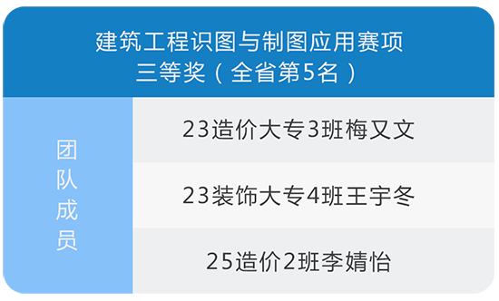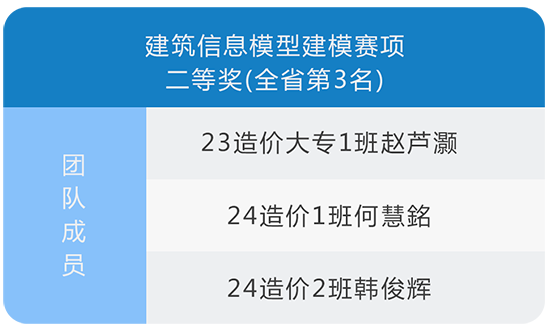 其中,23造价大专1班赵芦灏、24造价1班何慧銘、24造价2班韩俊辉组成的团队,荣获建筑信息模型建模赛项全省二等奖(第3名);23造价大专3班梅又文、23装饰大专4班王宇冬、25造价2班李婧怡组成的团队,斩获建筑工程识图与制图应用赛项全省三等奖(第5名)。