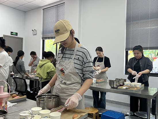 实操环节中,青年学员们分组协作、动手实践,从称量食材、搅拌混合到揉制面团、搓成圆球状,每一个步骤都做得格外认真。吕樱老师穿梭在学员中间,一对一进行指导,及时调整大家的操作手法,帮助大家攻克技术难点。随着烤箱温度逐渐升高,软糯香甜的气息弥漫整个教室,学员们相互交流制作心得,分享操作中的小技巧,现场充满了欢声笑语。
