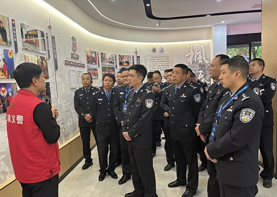 重庆市大足区公安局副局长罗存伟率各派出所负责人一行,以及上海铁路公安局南京公安处南京南站派出所所长侍亚州带领民警团队,先后来到红枫义警工作站考察调研。考察团实地察看阵地建设、队伍管理、工作台账等情况,详细了解红枫义警的发展历程、组织架构与运行模式。在工作站负责人陈荣周的讲解引导下,考察团认真聆听红枫义警秉持“崇法尚义、积安向善”宗旨,开展治安巡逻、法治宣传、矛盾调解、爱心救助等工作的实践成果,近距离感受这支民间公益力量扎根基层、守护平安的初心与担当。