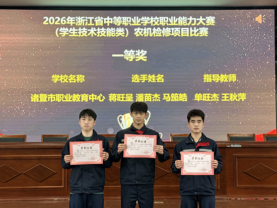 在2026年浙江省中等职业学校职业能力大赛(学生技术技能类)中,诸暨市职业教育中心积极组织参赛,所参加的五项赛事全部获奖,其中农机检修、园林微景观设计与制作两个项目荣获省一等奖并成功晋级全国大赛,新能源汽车维修、种养技术、婴幼儿保育三个项目荣获省三等奖。本次大赛是浙江省职业教育技能比赛中较最权威赛事,能从全面检验中职学校技术技能人才培养的水平。学校参赛师生面对强手如林的竞争环境,沉着应战、稳定发挥,在多个赛项中脱颖而出,充分展现了学校扎实的技能教学成果和学子精湛的专业素养。