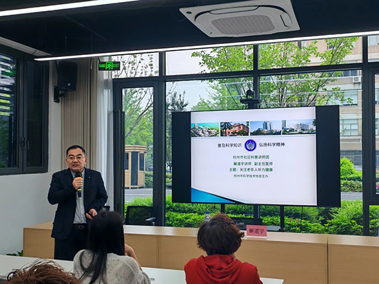 活动伊始,主持人详细介绍了杭州市社区科普讲师团解道宇讲师的专业背景。解道宇讲师现任杭州师范大学附属医院耳鼻咽喉头颈外科副主任医师,专业底蕴深厚、临床经验丰富。讲座中,解道宇讲师结合临床诊疗经验,用通俗易懂的语言深入剖析了老年人听力下降的常见诱因,从生理性衰老、耳部疾病、用药不当、环境噪音等多个维度展开细致讲解,同时分享了科学护耳的实用方法,包括合理控制音量、避免耳部外伤、均衡饮食调理、定期听力筛查等关键要点,并结合中医养生理念,手把手教给居民数套简单易操作的耳部按摩手法,通过按压耳门、听宫、听会等穴位,促进耳部血液循环,预防听力衰退。