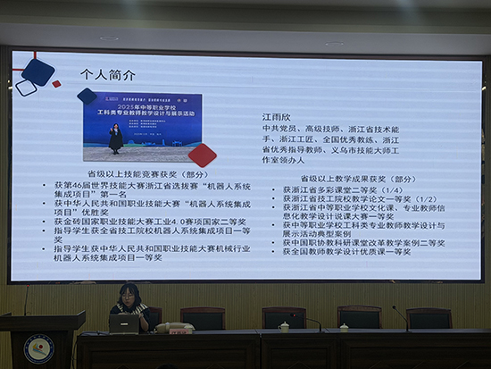 随后,杭州市电子信息职业学校宣琪老师作专家讲座《人机协同下的课堂数智化变革》,结合一线教学案例,系统阐释了人工智能与教师协同的新型教学模式,引发了与会教师的广泛关注与深入思考。紧接着,三位教师分别作专题发言:浙江机电技师学院江雨欣分享《信息化教学实践与成果展示交流》,东阳第二职校施丽燕以《从“手艺人”到“新工匠”:重构中职汽修课堂的底层逻辑》为题探讨了汽修专业教学的转型路径,兰溪中德职教集团李双彤围绕《教研相长:教师教学与科研的融合之道》展开交流。当天活动结束后,参训教师在学校食堂用餐,随后入住酒店。