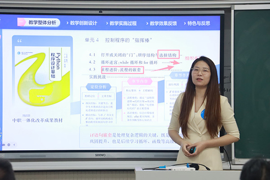 4月22日,黄岩区第一职业技术学校的徐越老师首先进行了《人生的365次方——while循环》的说课展示。徐越老师还结合市赛、省赛到国赛的历程,分享了选题、教学设计及AI工具的运用等经验与方法,让听众清晰理解了信息化说课的系列准备工作。