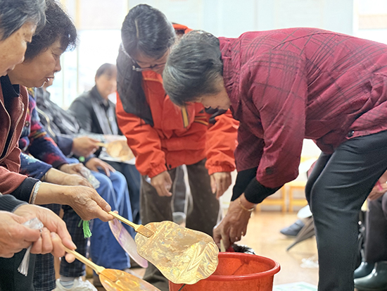 老年朋友们神情专注、兴致盎然,纷纷拿起工具随心创作,大家或是勾勒简约雅致的纹样,或是搭配温润柔和的色彩,一笔一画认真勾勒打磨,彼此之间轻声交流创作心得,互相分享配色灵感,现场欢声笑语不断,暖意融融。在轻松愉悦的氛围里,长辈们沉浸式体验传统漆扇手工技艺的魅力,亲手完成专属漆扇作品,既锻炼了手部精细动作与专注力,也在动手创作中收获满满的成就感与闲暇乐趣。