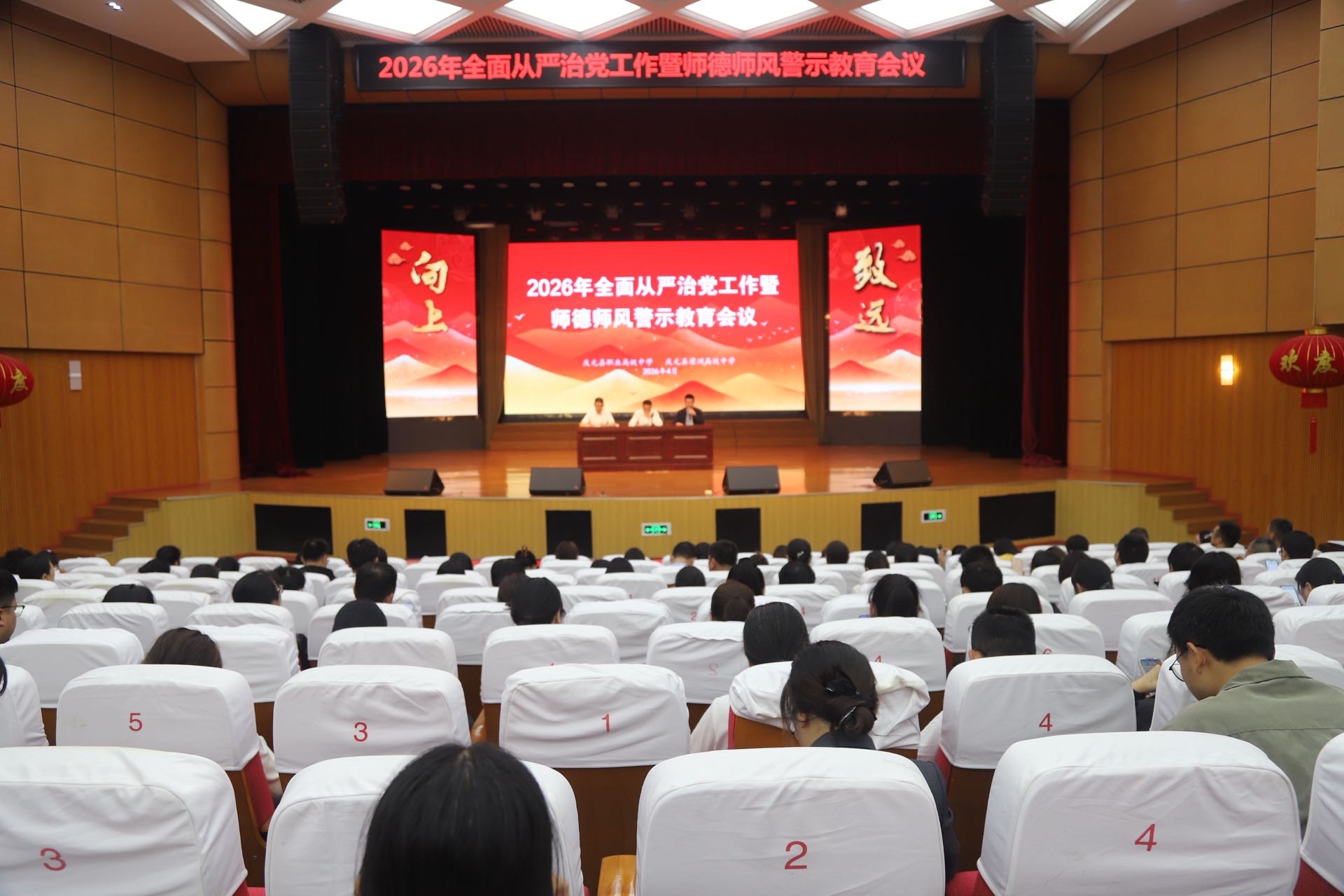 4月22日,庆元县职业高级中学(濛高)在学校报告厅召开2026年全面从严治党工作暨师德师风警示教育会议,校班子成员及全体教职工参加会议。会议由校长张发主持。