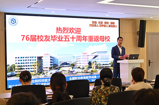 4月26日上午,杭州市乔司职业高级中学(原乔司中学)1976届高中三个班的60位校友代表回到母校,举行毕业五十周年纪念活动。同学会上,副校长喻新凯代表学校讲话,汇报学校概况和办学成绩,向跨越半个世纪“回家”的各位校友致以热烈的欢迎和诚挚的问候。