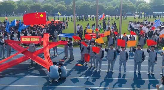 伴随着《运动员进行曲》的铿锵旋律,国旗队、彩旗队、鲜花队率先入场。随后,95个班级组成的15个德育组方阵步伐整齐、口号嘹亮,依次走过主席台。青春的笑脸与飘扬的旗帜交相辉映,点燃了全场的热情。