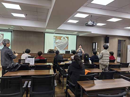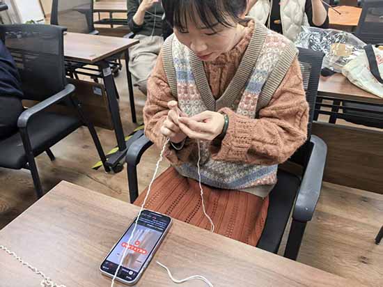 在毛线编织课堂上,色彩斑斓的毛线在指尖翻飞,教室里钩针碰撞的清脆声响,成为一种极具治愈感的“春日节奏”。老师从材质、针法到密度,一点点细心讲解。许多居民是第一次拿起编织针,起初动作有些生涩,但老师放慢示范,还走到每个人身边单独指导。渐渐地,针脚从歪扭变得整齐。学员们学习十分认真,或凝神练习,或互帮互助,在一钩一引之间,完成了从生疏到熟练的蜕变。课程如解锁关卡,从基础针法,到经典格纹、配色、收针……大家沉浸在一勾一绕的世界里,偶尔低声交流,互相帮忙。几节课下来,零散的毛线渐渐显露出围巾的样貌,每个人手中的颜色与花纹都独一无二。这种氛围,早已超越了单纯的技能教学,成为一场邻里间心手相连的温馨聚会。