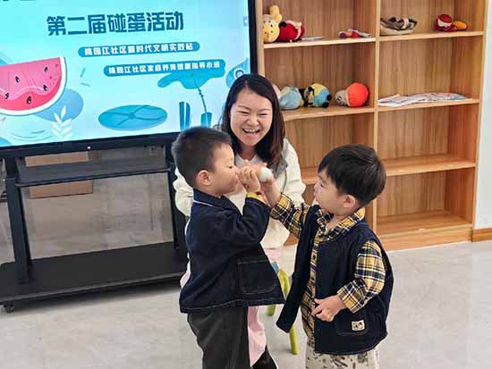 碰蛋游戏将活动氛围推向高潮,孩子们手持彩蛋两两友好比拼,欢笑声、加油声萦绕全场,活动还现场评选出“蛋王”,让大家在民俗互动中体会传统游戏的乐趣。
