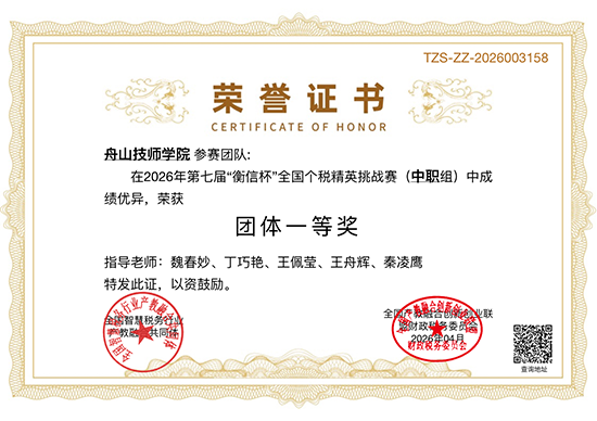 近日,2026年第七届 “衡信杯”全国个税精英挑战赛(中职组)圆满落幕。舟山职业技术学校25会计中高职一体班44名学子,在班主任、成长导师及专业教师的悉心指导与组织下,历经14天紧张激烈的角逐,从全国68支参赛队伍中脱颖而出,以总成绩第八的优异表现斩获大赛一等奖,充分展现了学校会计专业学子扎实的专业功底与良好的职业素养。