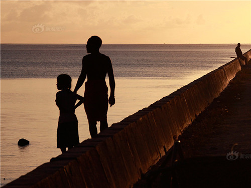 当地人站在连接了南塔拉瓦的环礁岛们的堤道上欣赏着落日。在抨击各国在应对全球变暖缺乏作为方面,小岛国领袖发言越来越有力。塞舌尔总统米歇尔在小岛国峰会上表示,大型企业的利益支配相关辩论的时间已经太长,而留给各岛国的时间已经不多了。